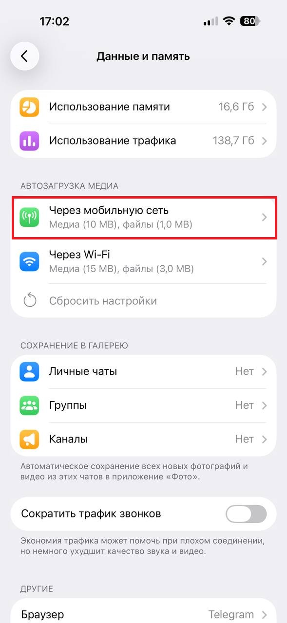— Открываем приложение и заходим в «Настройки». В разделе «Данные и память» открываем «Через мобильную сеть». Здесь можно изменить параметры автозагрузки медиа. Самый лучший вариант — выбрать низкий расход трафика. В этом режиме приложение будет автоматически загружать только фотографии.