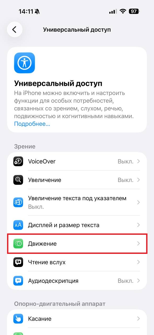 Чтобы снизить частоту обновления экрана откройте «Настройки» и найдите «Универсальный доступ», там выберете «Движение» и активируйте «Ограничение частоты кадров».