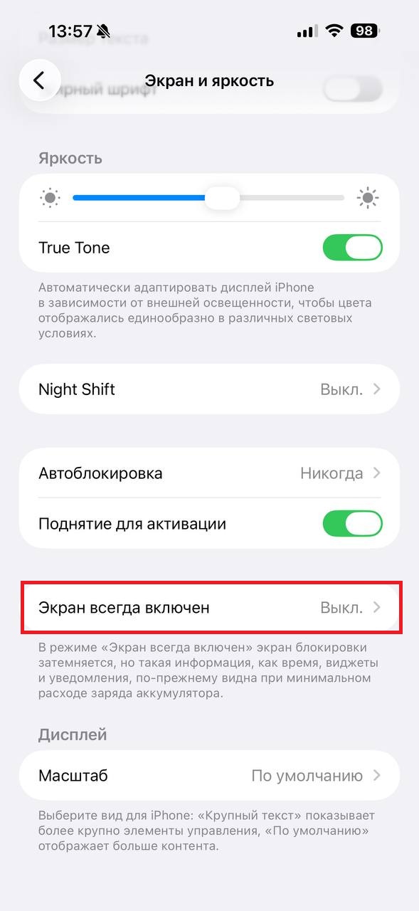 Чтобы ее отключить откройте «Настройки», перейдите в раздел «Экран и яркость» и отключите пункт «Экран всегда включен».