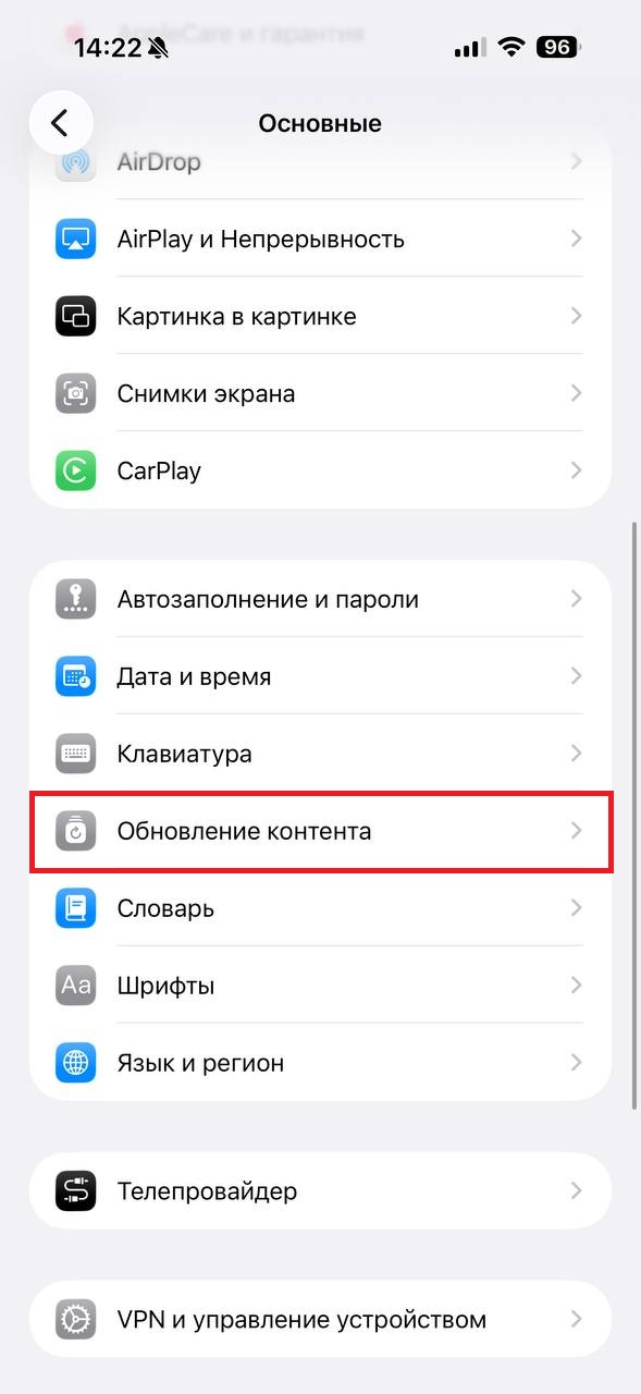 Открываем «Настройки», ищем «Основные» и «Обновление контента». Деактивируем или выбираем из списка только те приложения, которые реально должны обновляться в фоне.